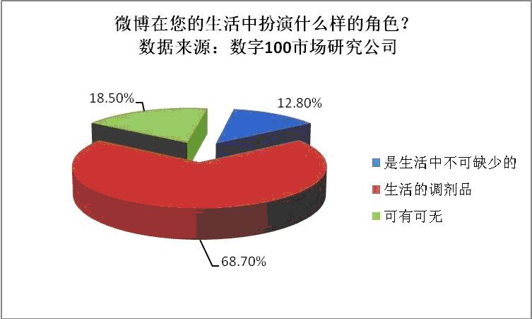 数据显示,“畅所欲言、表现自我、交流互动”是公众最为认可“微博”功能。女性比男性更看重“微博”互动交流的功能。这可能受到女性沟通“多频次,浅交流”特性地影响。当被问及“微博”代表着什么样的生活态度时,有40%的人觉得是“简单随性”,还有18.1%的人选择了“积极乐观”。而“在你的生活中扮演什么样的角色?”中,大部分人认为是“生活的调味品”。这些数据也从侧面印证了“微博”个性化自媒体的产品特性。