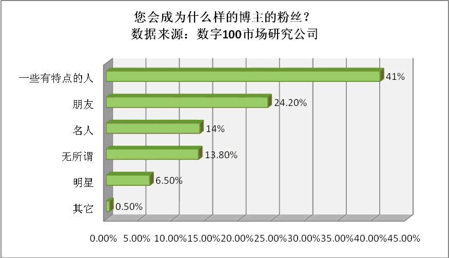 调查表明,有44%的人表示会成为一些有特点(如专业人士)人物的粉丝,这部分人群中,18-24岁的人比例略高,显示出年轻人从盲目崇拜名人明星,演变为“追求个性、特立独行”。有23%的人表示会成为朋友的粉丝。一般来说,一个普通的“微博”用户的被关注人数应该是几百个左右,但是也不能忽略草根用户的威力,因为这些用户更多的是和身边的朋友相互关注,他们之间的传播更具影响力。另外,还有14%的人仍然喜欢名人的微博。特别是现在已经使用“微博”的受访者中比例较高。这类人群使用“微博”非常娴熟,并且形成了固定使用习惯,往往成为线上传播的主力。