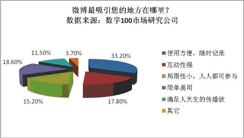 调查数据显示,有70%的人知道微博,有30%的人知道,并已经使用了,从知道比例来看,还30岁以下的人群对“微博”这种新事物的接受程度较高。在“微博”吸引力调查中,36.4%的人认为“使用方便,随时记录”是其最大的魅力所在。对于这一点,已经使用者认可度大大高于其他人群。这其中又以18-24岁的人为主。同时,有19.5%的人觉得其互动性强,也是吸引自己的地方。